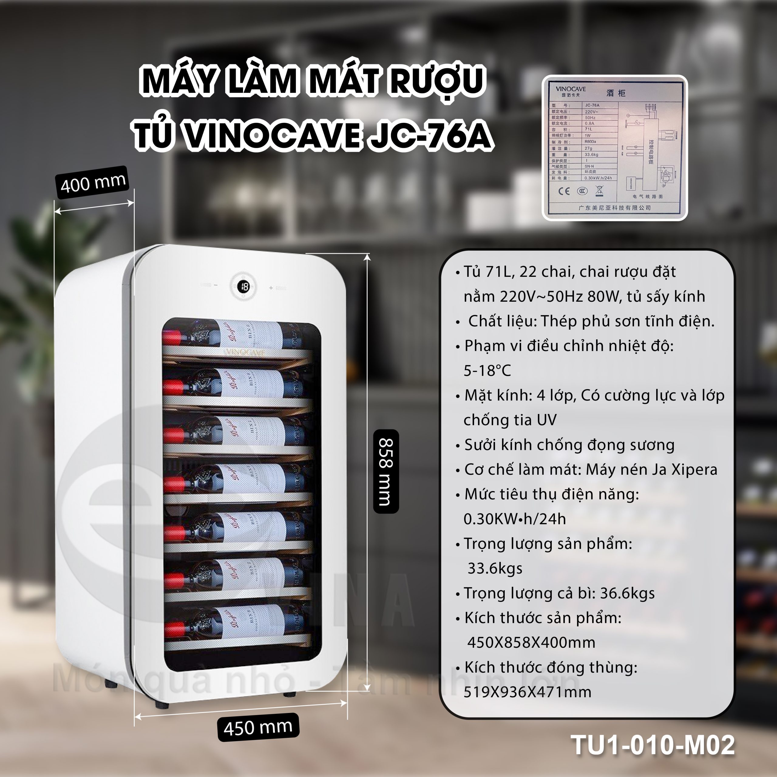 Máy làm mát rượu Vinocave JC-76A thuộc dòng sản phẩm tủ rượu vang cao cấp với nhiều tính năng nổi bật. Được thiết kế hướng đến sự tiện dụng và tao nhã, sản phẩm này sẽ đáp ứng tốt nhu cầu lưu trữ rượu của mọi tín đồ yêu thích đồ uống này.