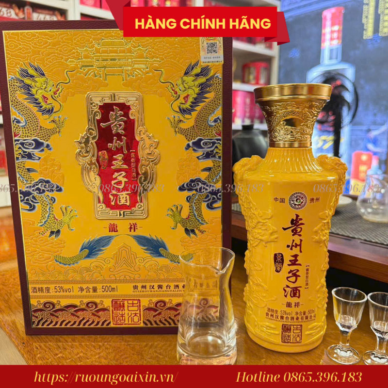 Thiết kế của chai rượu cũng là một điểm nhấn, với màu vàng chủ đạo, tượng trưng cho sự giàu sang và quyền quý. Hộp đựng rượu được thiết kế sang trọng, đi kèm với hai ly thủy tinh cao cấp, tạo nên một món quà biếu đẳng cấp và ý nghĩa. Rượu Mao Đài Hoàng Tử Quý Châu không chỉ là một thức uống, mà còn là một tác phẩm nghệ thuật, thể hiện sự tinh tế và gu thẩm mỹ của người sử dụng.