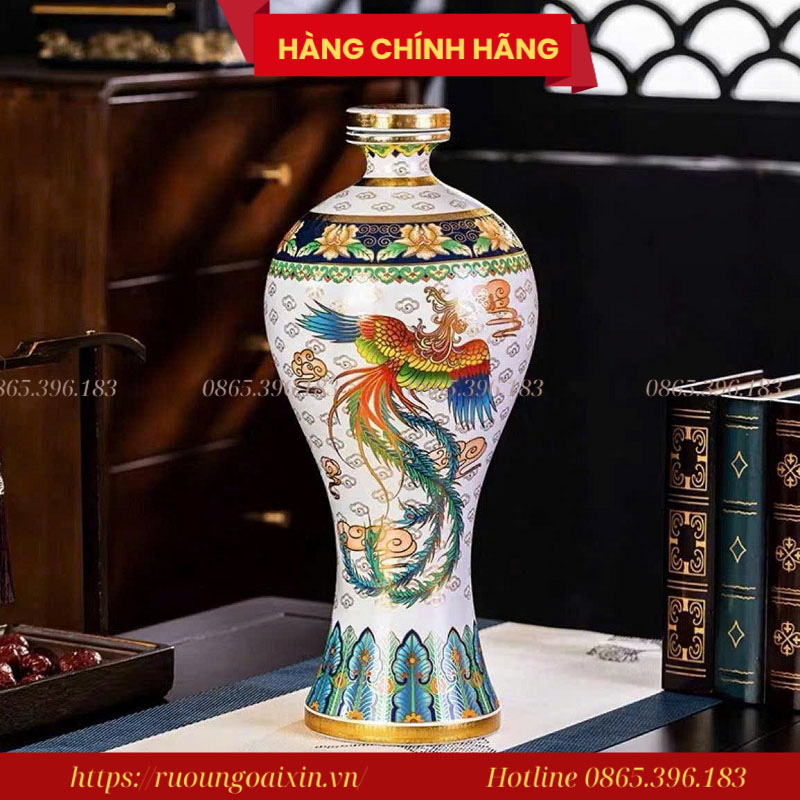 Bình đựng rượu Mao Đài Phượng Vũ Thiên Môn được chế tác từ gốm sứ cao cấp, với thiết kế tỉ mỉ và tinh xảo. Hình dáng bình được thiết kế theo chuẩn phong thủy, với miệng loe, thân phình và cổ thắt, tượng trưng cho sự thu hút và giữ gìn tài lộc. Bề mặt bình được trang trí bằng họa tiết phượng hoàng, một biểu tượng của sự tái sinh, quyền quý và may mắn trong văn hóa Trung Hoa. Các chi tiết trên bình được vẽ tay một cách tỉ mỉ, thể hiện sự khéo léo và tâm huyết của người nghệ nhân. Màu sắc của bình cũng được lựa chọn cẩn thận, thường là các gam màu trang nhã như trắng, xanh lam hoặc xanh ngọc, tạo nên vẻ đẹp sang trọng và tinh tế.